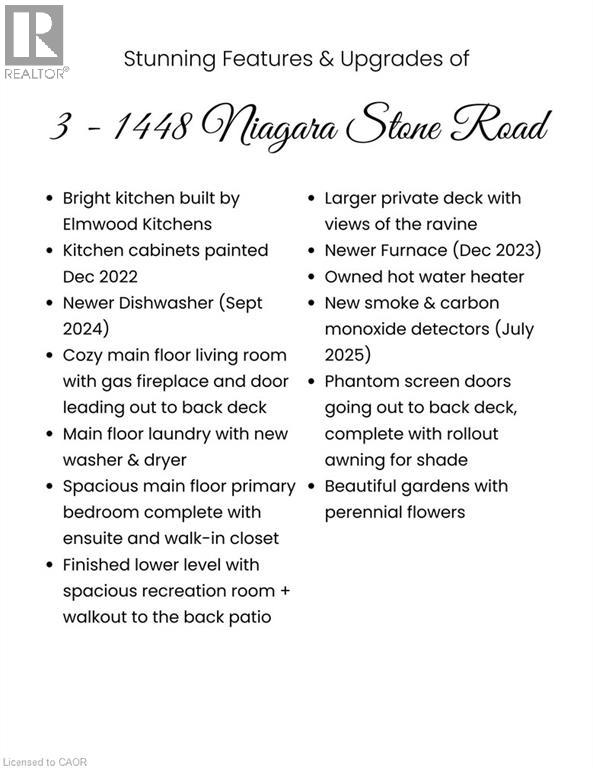 $635.06 MonthlyRARE RAVINE LOT! Only a few houses in this complex back onto this lush forest. Private and serene with two walk-outs to the back, one to an oversized deck complete with awning off the main floor, and the other lower level walk-out to the gardens and ravine. This bungalow townhouse (over 2000 finished sqft) is meticulously maintained featuring 2+1 bedrooms and 3 full baths. Updated Elmwood kitchen is bright and spacious, plus includes walk-in pantry. Main floor laundry with brand new washer and dryer as well. Generous living spaces - living room, dining room, and wall-to-wall windows facing the forest. 2 walk-in closets. Large rec room on lower level with fireplace, third bedroom and full bath. Just move in and enjoy. Close to everything Niagara-on-the-Lake has to offer - wineries, restaurants, theatre, shopping, and so much more. The affordable maintenance fee covers all your needs. Outer parts of the home, roof, windows, cable TV, snow, grass, and so much more. Must see! Won't last! (id:8999)